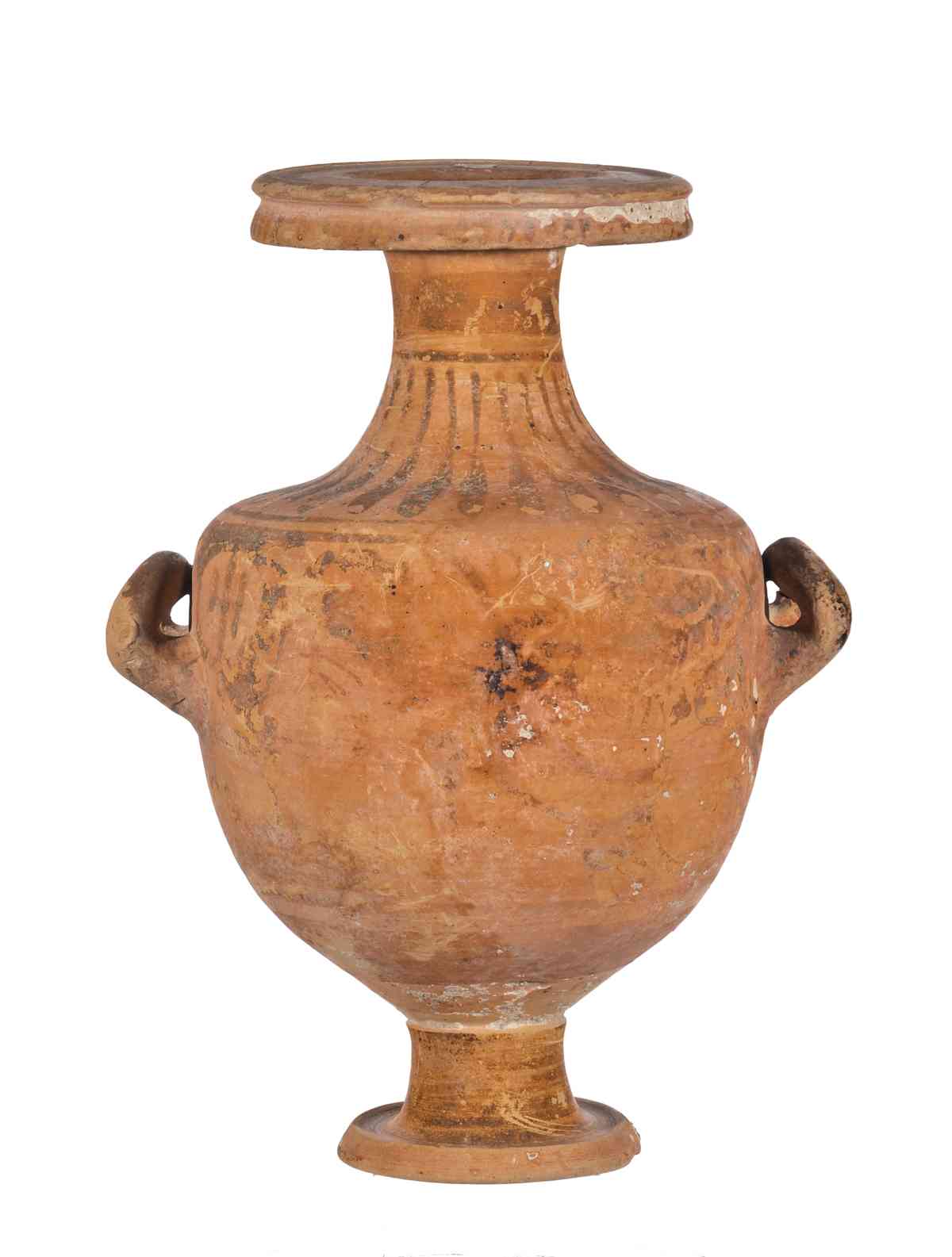 Argilla rosata (Munsell 7.5 YR), vernice totalmente abrasa, con le immagini sovraddipinte di difficile o impossibile lettura. Il vaso presenta una stretta imboccatura con orlo fortemente estroflesso distinto e labbro modanato; il corpo globulare, ma rastremato verso il fondo, poggia su un piede a disco dal profilo troncoconico con alto stelo. Il vaso presenta due anse a bastoncello, impostate orizzontalmente e tanto ripiegate da toccare il corpo del vaso. La terza ansa, sempre a bastoncello, è verticale e impostata tra orlo e spalla. Purtroppo la decorazione, vista la forte abrasione della vernice, appare quasi del tutto corrotta e difficilmente decifrabile. Si può notare tuttavia un elemento della decorazione accessoria, costituito da una fascia decorata a baccellatura nello spazio compreso tra collo e spalla. Dal momento che la forma non trova confronti con la ceramica lucana, resta dubbio l'inserimento di questo vaso in tale categoria. Sul vaso sono presenti diverse etichette: una sul piede, con indicazione del numero '74'; in prossimità della scritta 'dono Picotti | 3 12 1943 | 2288'. L'etichetta sembra posta su un'etichetta precedente, non più leggibile. Dall'altra parte dell'anello del piede si nota la scritta 'Arezzo', che compare anche su una seconda etichetta apposta presso l'ansa orizzontale destra, immediatamente sotto la spalla, forse ad indicare il luogo di acquisto o provenienza del reperto. Vi è infine una terza etichetta sull'orlo del vaso, sulla quale si legge la scritta '109'.