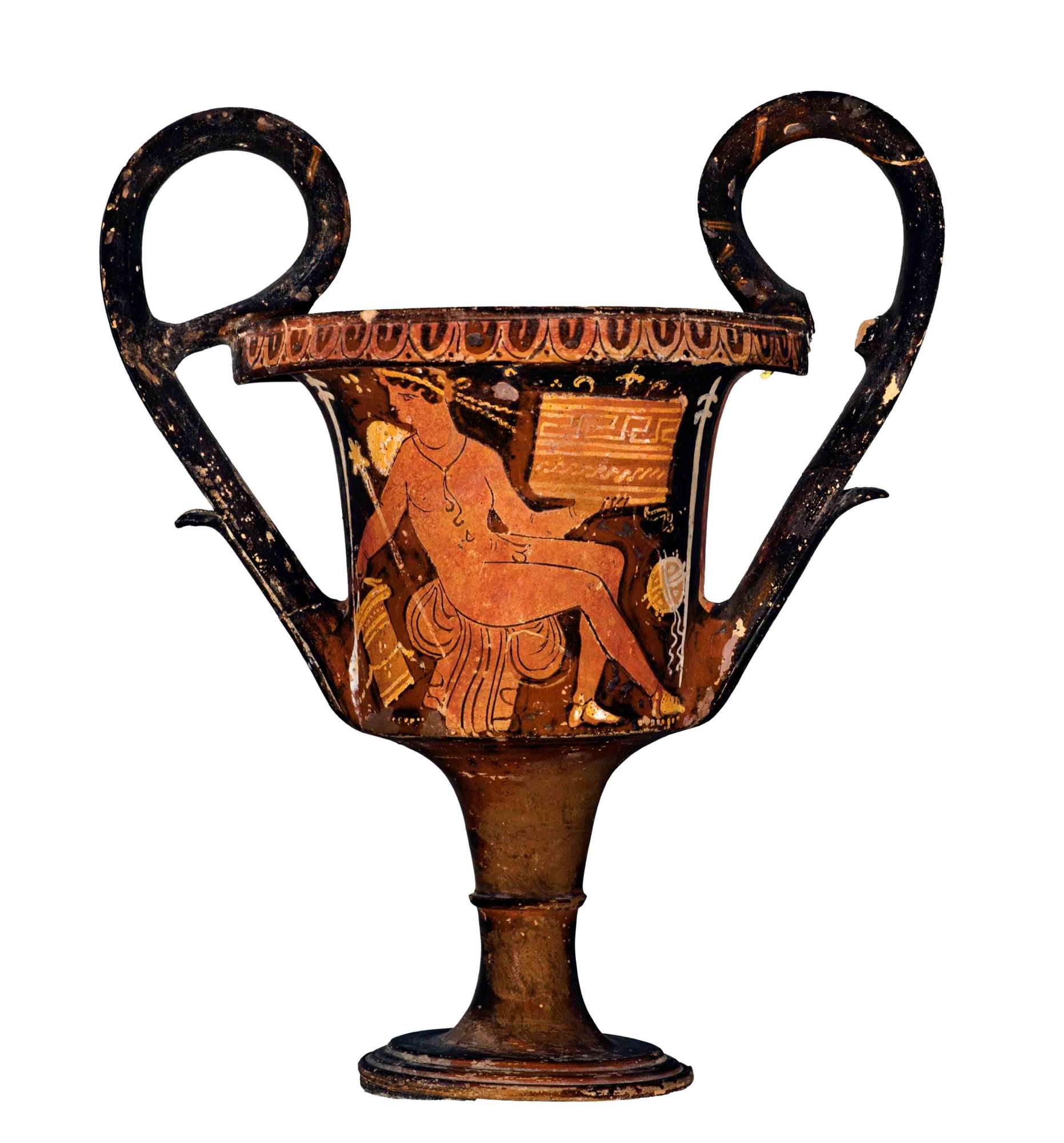 Orlo svasato con labbro revoluto; bicchiere a profilo leggermente concavo; Lato A: erote seduto con phialè e situla tra due colonne Erote seduto su drappo di tre quarti verso destra e retrospiciente. Regge nella destra un piccolo tympanon pendente da nastri sovradipinti e decorato con doppia croce sovradipinta in bianco e giallo. Nella sinistra tiene una situla profilata in giallo con decorazioni lineari e puntinate sovradipinte; sempre nella s. patera profilata in giallo sovradipinto con corona di tratti centrale. Sulla patera, offerte vegetali: foglia d’edera nella metà s. sovradipinta in bianco tra coppia di foglie spiraliformi con linea mediana in nero e puntinata in giallo. Numerose decorazioni sovradipinte: porta i capelli raccolti in un sakkòs campito in bianco con nastri e decorazioni in giallo; sulla fronte fila di vaghi in giallo, pendente oltre l’orecchio. Le ali campite superiormente in bianco sono decorate nella parte inferiore da una fascia in nero con puntini in giallo e da una serie di linee diritte. Armillae ai polsi, collana a due file di vaghi circolari – uno girocollo, l'altro a tracolla e ricadente sul petto – e decorazioni sulle embades ai piedi, tutte in giallo sovradipinto. Ambientano la scena due sottili colonne sovradipinte in bianco. Nel campo, in alto, benda sovradipinta con nastro pendente in giallo; linea di terra puntinata in giallo con due fiori sovradipinti a tre petali e a campanula. Lato B: giovane seduto con cista tra due colonne Figura maschile di tre quarti verso destra, retrospiciente, seduto su drappo con pieghe in vernice nera diluita. Il giovane, nudo, porta sul capo una corona con nastri in giallo; allacciato al collo e ricadente dietro alle spalle, un petaso campito in giallo e, ai piedi, delle embades altrettanto sovradipinte. Nella mano destra regge una cista con offerte vegetali sulla sommità e decorata con sovradipinture su più registri, con motivi lineari, a meandri e a ߵsʼ;Nella sinistra tiene un piccolo tympanon pendente e decorato con doppia croce sovradipinta in bianco e puntini e con nastri sovradipinti all’estremità. Nella d. stringe il manico di una situla con decorazioni lineari e puntinate in giallo. In appoggio all’avambraccio d. tirso con fusto in bianco (in parte evanido) e con coronamento radiale. Linea di terra puntinata in giallo. Ambientano la scena due sottili colonne sovradipinte in bianco. Nel campo, in alto, in giallo sovradipinto piccola rosetta e infiorescenza a tre punti.