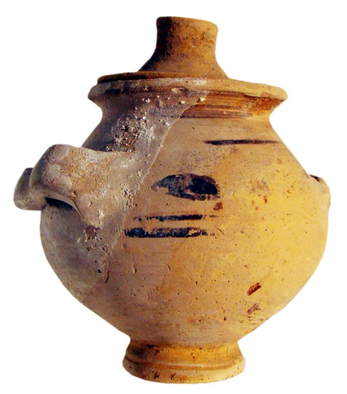Krateriskos con corpo piriforme a profilo convesso. Orlo svasato a profilo obliquo, anse a bastoncello impostate orizzontalmente, piede troncoconico. Coperchio con presa cilindrica. Mancante di un ansa. Decorazione a fasce rosso bruna, su fondo chiaro, di cui rimangono tracce sul corpo, dipinti l’orlo e il piede.