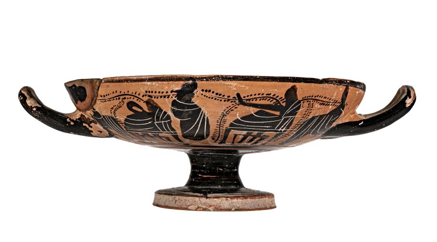 Kylix priva dello stelo attica a figure nere con colori aggiunti e graffito. Su ciascun lato si dispongono cinque personaggi. Accanto alle anse due personaggi femminili sono seduti su un diphros okladias, di profilo verso il centro della scena. Indossano un lungo himation drappeggiato e portano un’acconciatura raccolta. Presso di loro, rivolti entrambi verso sinistra, due figure maschili distese su kline. Sono senza barba, si appoggiano al braccio destro, mentre quello sinistro è alzato verso le donne. Anch’essi sono coperti da un himation drappeggiato e davanti a loro stanno basse mense da cui pendono otri. Al centro della scena, rispettivamente, sul lato “A”, in piedi verso destra, una donna con acconciatura raccolta ed un himation, mentre sul lato “B” un uomo, sempre avvolto da himation e coperto con un cappello a larghe falde. Sullo sfondo corrono tralci di vite con foglie a puntini. Il colore bianco viene impiegato per l’incarnato dei personaggi. A graffito vengono resi i panneggi delle vesti. Stile rozzo e corrente ma l’uso graffito per i particolari interni delle figure permettono di attribuirlo al Pittore di Caylus.