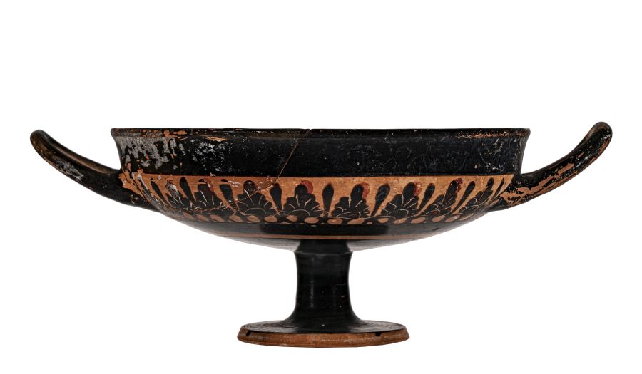 Kylix su basso piede attica a figure nere con tracce di colore rosse. Fascia di palmette.