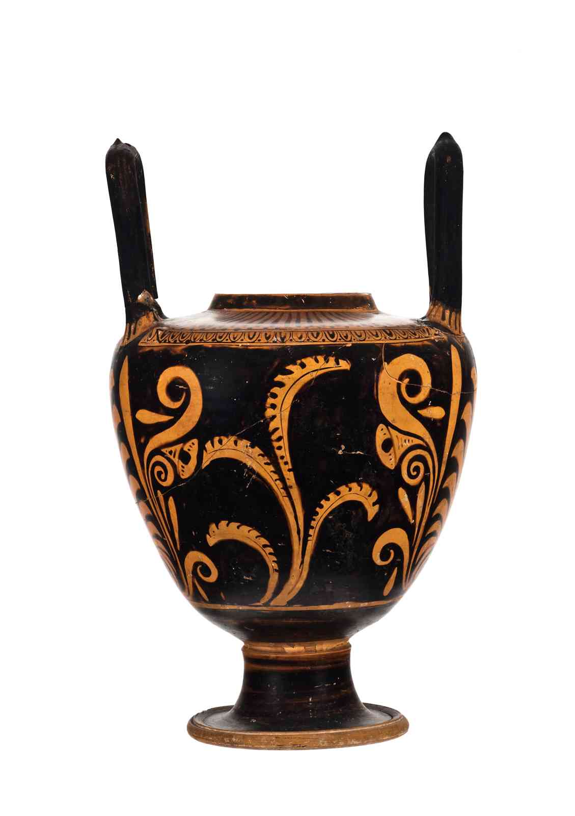 Argilla giallo rossastra (5 YR 6/6 Munsell); vernice lucente, di buona qualità, abbastanza ben conservata sebbene ci siano zone in cui appare diluita, il che ha causato problemi di cottura, specialmente poco al di sotto della spalla del lato A e presso il piede. Il vaso presenta un corpo ovoidale, con un'imboccatura non molto larga, su cui si imposta un breve labbro verticale, leggermente rastremato verso l'interno. Sulle spalle del vaso sono presenti, su entrambi i lati, due piccole protuberanze che sembrano quasi delimitare l'area sottostante, destinata alla decorazione figurata. Il vaso presenta poi una vasca profonda con fondo arrotondato che poggia su un piede a campana con stelo delimitato superiormente da una sottile modanatura, la quale si ripresenta anche sul bordo superiore dello spessore del piede. Il vaso presenta, impostate verticalmente sulla spalla, alte anse a bastoncello, sulla cui sommità sono presenti delle piccole protuberanze. Decorazione del lato A: al centro della scena è raffigurato un giovane stante e di profilo, che ha il baricentro spostato lateralmente, con il peso che poggia sulla sola gamba sinistra mentre la destra è leggermente piegata, a riposo. Ha i capelli corti ed è completamente avvolto da una veste caratterizzata dalla ricchezza dei drappeggi, che segnano le linee del corpo, e da un alto collo, la cui stoffa ricade sul petto. A sinistra è dipinto un ramoscello con nove foglie, forse di ulivo, e poco più in alto, all'altezza della testa del giovane, una palla a quattro spicchi. Decorazione del lato B: è raffigurato un elemento vegetale che occupa tutto lo spazio a disposizione. Le venature delle foglie sono rese per mezzo di spessi trattini neri, mentre il dorso delle foglie da linee molto sottili, che corrono per tutta la lunghezza dell'elemento vegetale. La decorazione accessoria è costituita, nello spazio sotto le anse, da girali fogliati e fioriti con campanule. Tra gli altri elementi decorativi vi è un sottile filetto risparmiato appena al di sotto del breve labbro verticale, che corre per tutta la circonferenza dell'imboccatura. A partire da questo comincia una fascia, che si estende per tutta la spalla in corrispondenza delle due scene figurate ed è decorata con baccellature, alternate a puntini lungo il bordo più esterno. Immediatamente sotto questa fascia, in corrispondenza del punto di passaggio dalla spalla al ventre, lungo la linea ideale che collega le due protuberanze, corre un fregio costituito dal ricorrere dalla sequenza ovulo-guscio-puntino. Sotto le scene figurate, lungo tutto la circonferenza del vaso, vi è una sottile fascia risparmiata. Un'ulteriore fascia risparmiata sottolinea, insieme ad una sottile modanatura, il punto di stacco tra ventre e piede, mentre il bordo superiore e lo spessore del piede sono interamente risparmiati. La base degli attacchi delle anse è decorata con una fascetta baccellata.