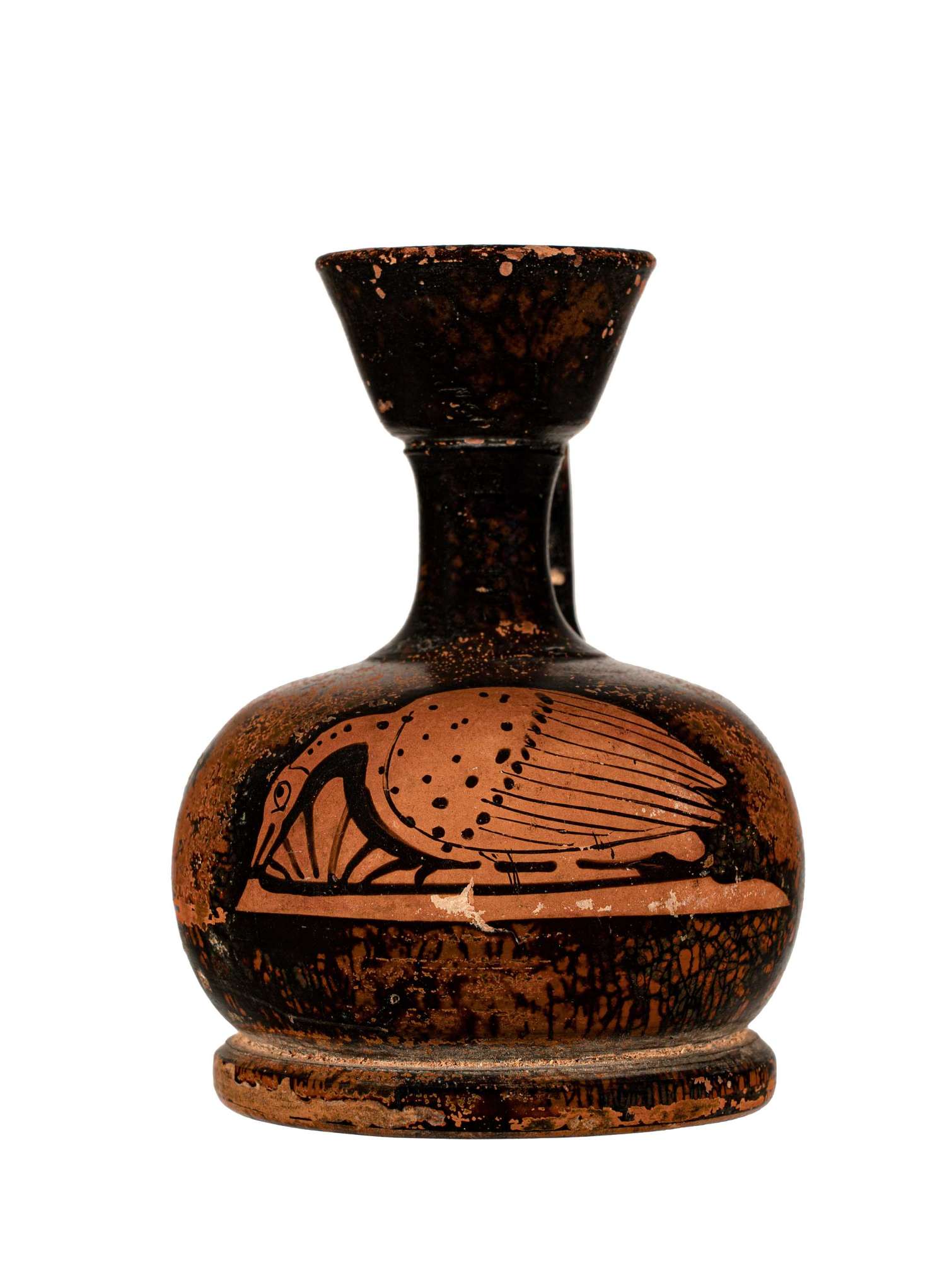 Lekythos aryballica attica a figure rosse a ventre globulare e base piatta con cigno.