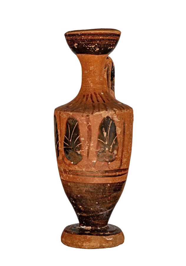 Lekythos attica a figure nere con graffito: tre palmette alternate a loto su girali.