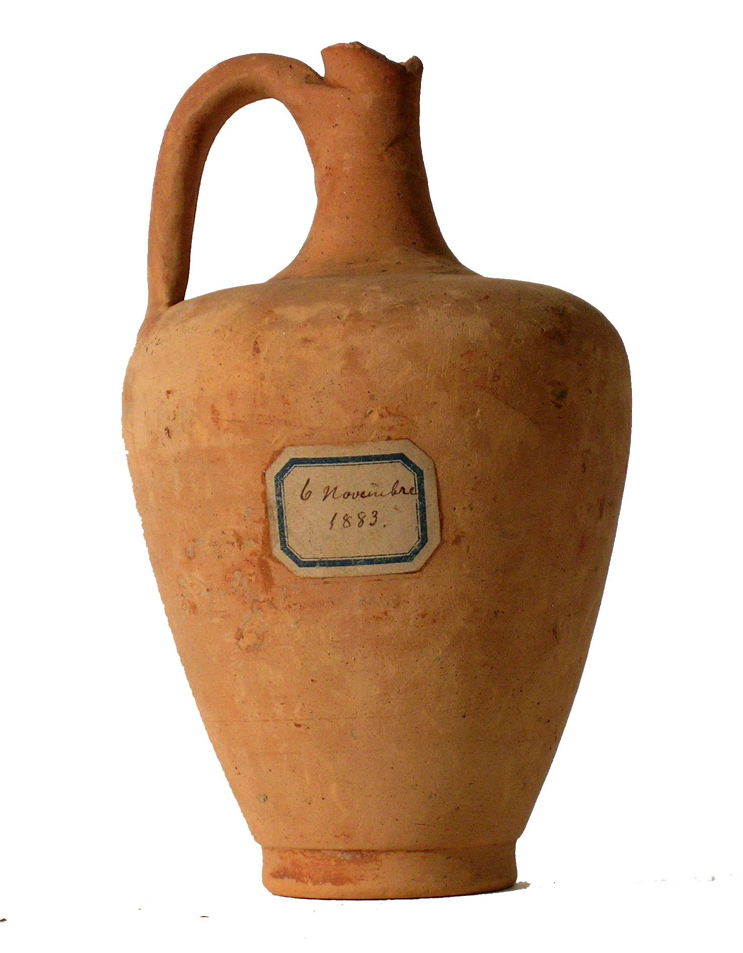 lekythos a corpo piriforme con ansa a nastro con costolatura centrale, bocca sezzata