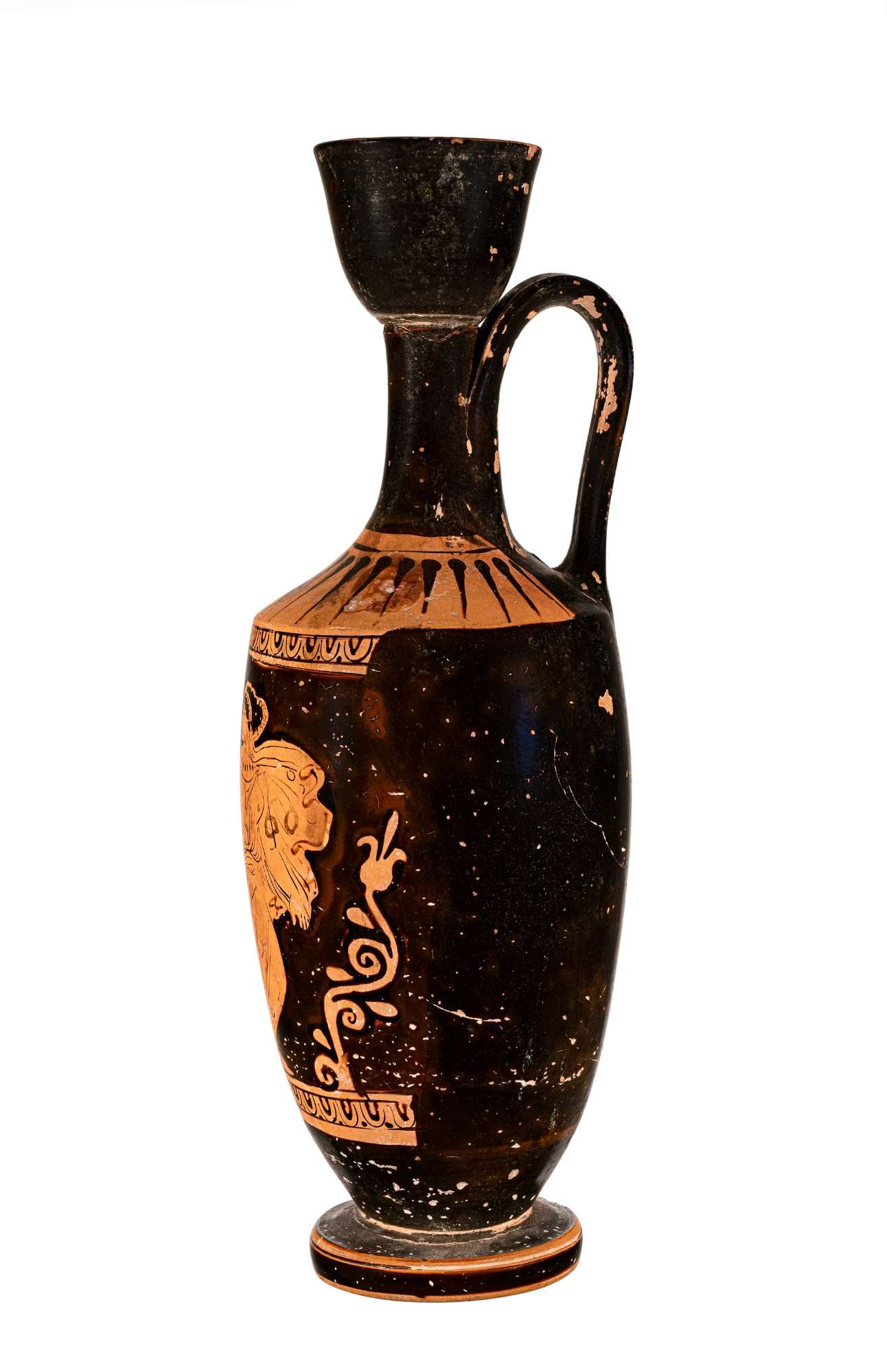 Lekythos attica a figure rosse con immagine di donna con chitone e himation svolazzante, seno in rilievo, in fuga verso destra, volge il capo all'indietro.