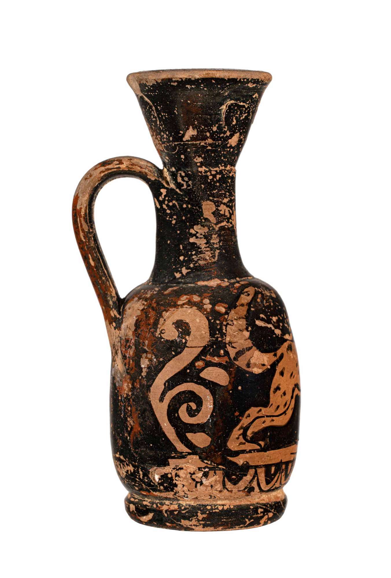 Lekythos attica a figure rosse, palmetta sotto l'ansa e felino in corsa.