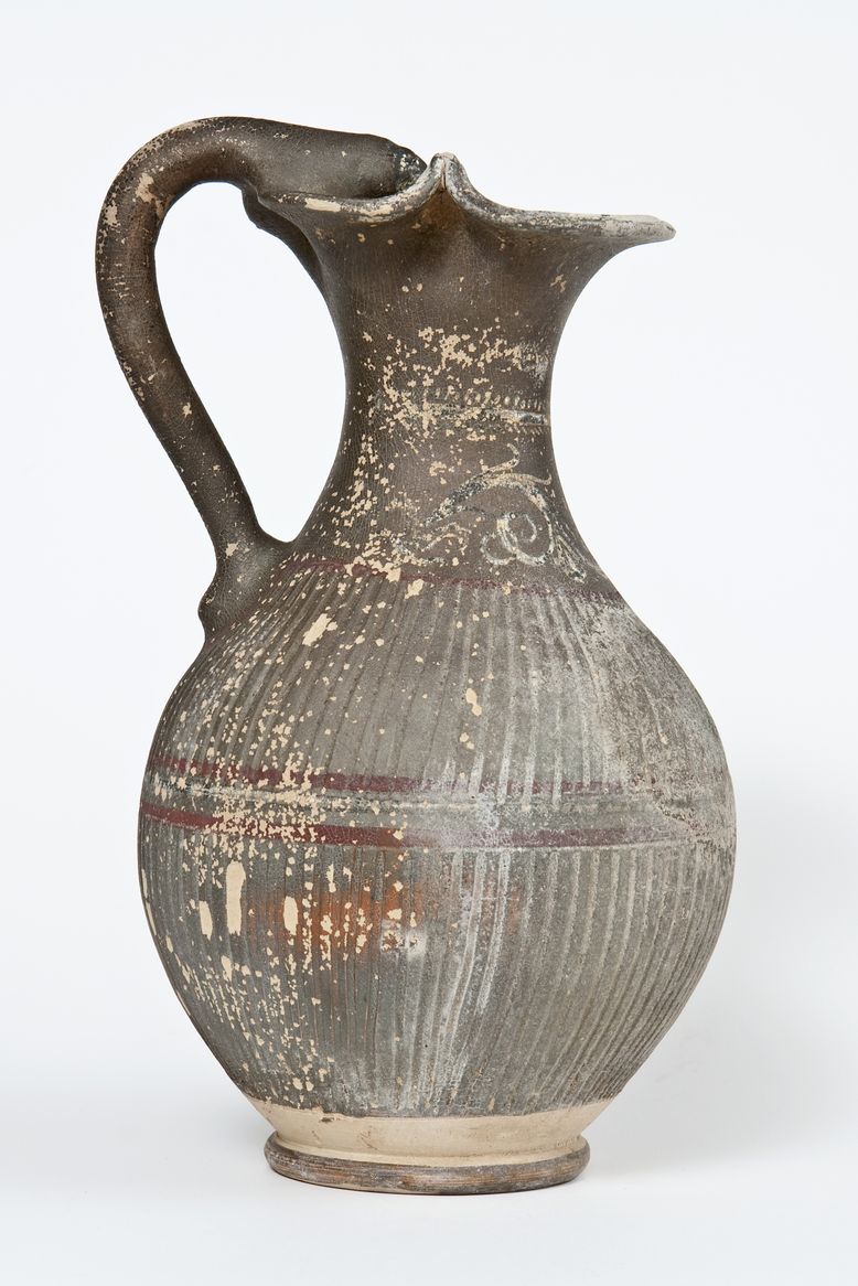 Oinochoe a vernice nera opaca tendente al grigio, con sovraddipinture in bianco, giallo e rosso amaranto. Labbro leggermente modanato, orlo estroflesso e trilobato, collo a profilo concavo, corpo globulare strigilato, con fascia liscia tra le strigilature, ansa a bastoncello verticale desinente alla sommità, nel punto d’attacco all’orlo, in una protome ferina, basso piede ad anello. Sul collo: ramo secco orizzontale dipinto in giallo su base bianca, sotto il quale si trova un complesso di girali e fiori campanulati della stessa tonalità, una linea in rosso amaranto delimita, poi, il corpo strigilato. Sul corpo, nella fascia liscia tra le strigilature, evidenziata da una coppia di linee dipinte in rosso amaranto, linea in giallo, su base bianca.