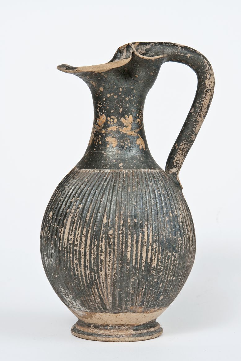 Oinochoe a vernice nera opaca, tendente al grigio, con sovraddipinture in bianco e giallo ocra. Labbro leggermente modanato, orlo estroflesso e trilobato, collo a profilo concavo, corpo globulare strigilato, ansa a bastoncello verticale, desinente alla sommità, nel punto d’attacco all’orlo, in una protome di serpente, breve gola di raccordo, basso piede ad anello modanato. Sul collo: tralcio di edera con stelo sinuoso dipinto; rosette di punti e petali a semicerchio in giallo.