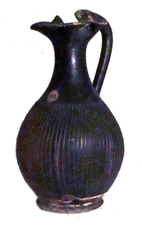 Oinochoe a corpo baccellato con attacco d'ansa a testa di animale, vernice nera priva di sovraddipintura