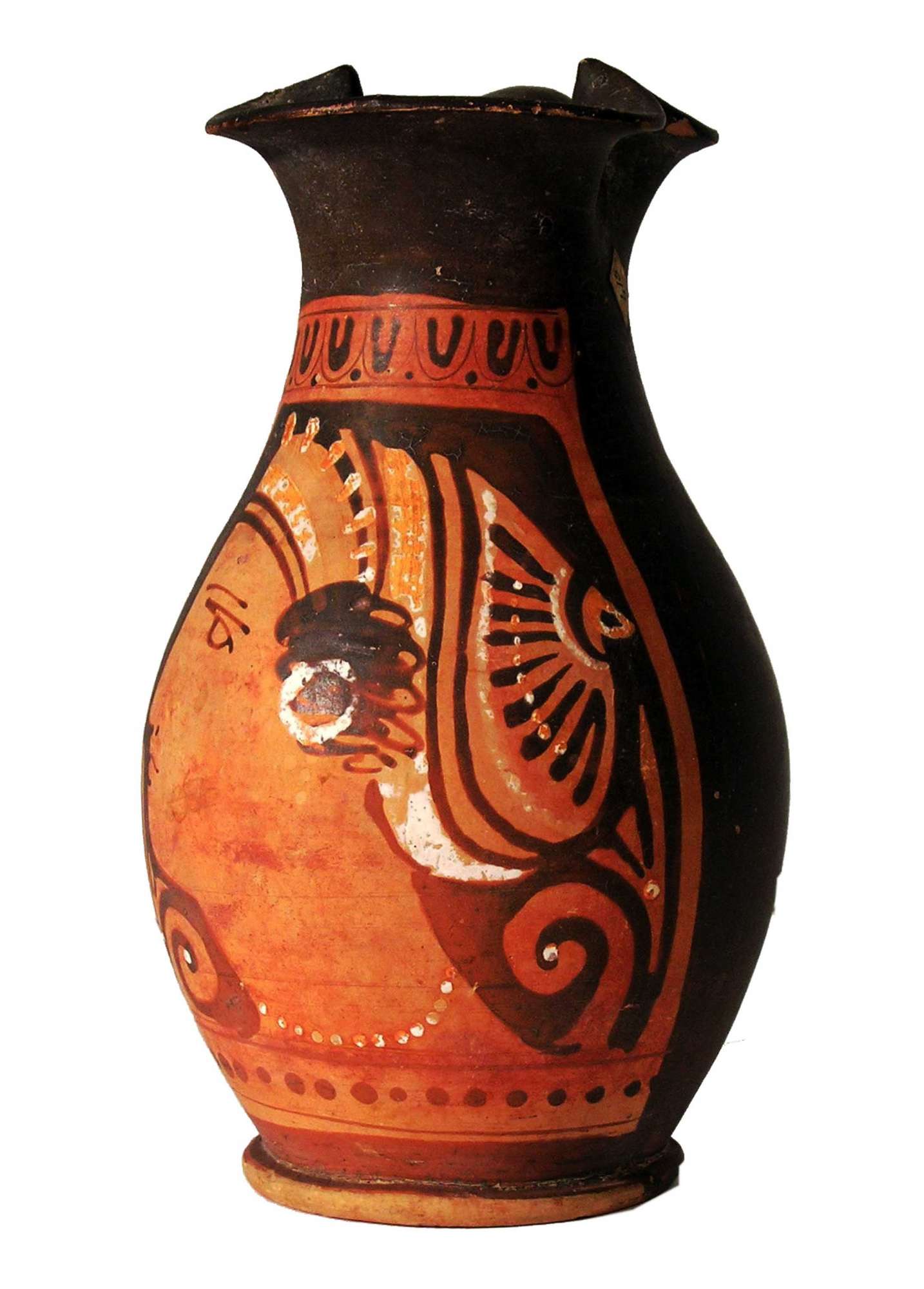 Oinochoe apula a figure rosse e dettagli in bianco con testa femminile con mitella e collana