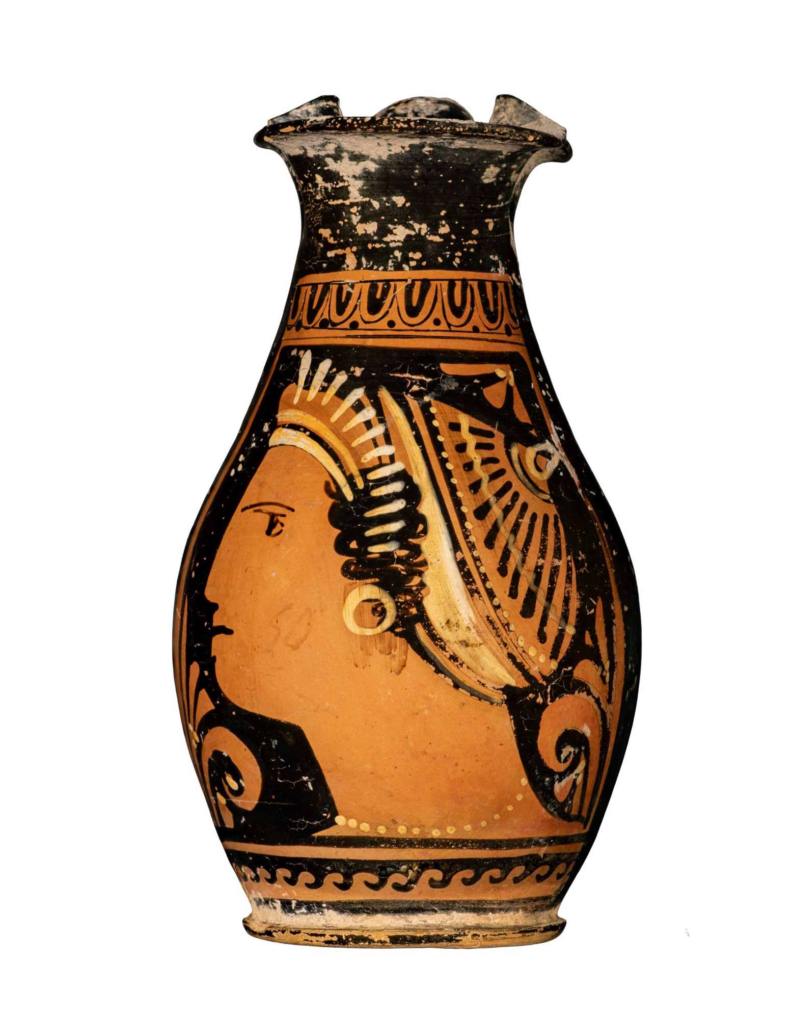 Oinochoe apula a figure rosse con dettagli in bianco. Testa femminile con mitella e collana.