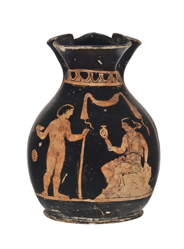 Oinochoe apula a figure rosse con ventre espanso e breve spalla. Entro un pannello: giovane stante nudo con coppa e bastone e donna seduta con specchio; palla a spicchi e benda sospesi in aria.