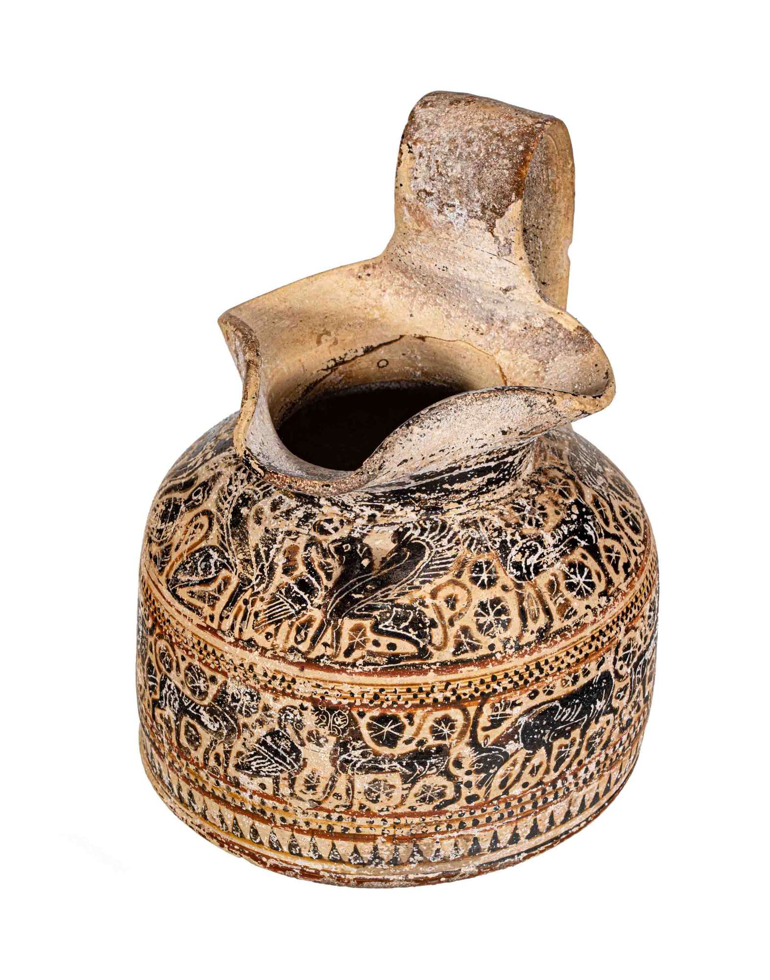Oinochoe corinzia a bocca trilobata a ventre troncato da base piatta; ansa sopraelevata; decorata da teorie sovrapposte di grifi, uccelli pantera e capro, graffiti e dipinti.