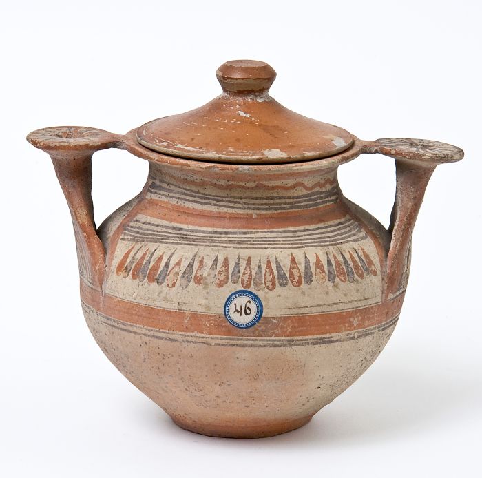 Olla con coperchio in ceramica messapica. Anse verticali in forma di scalpello unite al labbro mediante rotella, basso collo troncoconico a profilo convesso, corpo biconico, apoda a base piana. Decorazione bicroma in rosso e bruno su fondo di argilla naturale. Su entrambi i lati, sul collo, riquadro con motivo a tremulo e linee parallele; sulla spalla, riquadro con linee parallele e fascia di foglie lobate brune e rosse alternate; sul ventre, fascia rossa e linee brune; sulle rotelle, dipinte in rosso, giro di foglie in chiaro uscenti dal centro di esse, incavato; orlo e base interamente dipinti. Coperchio con pomello a sezione biconica, con estremità piatta.