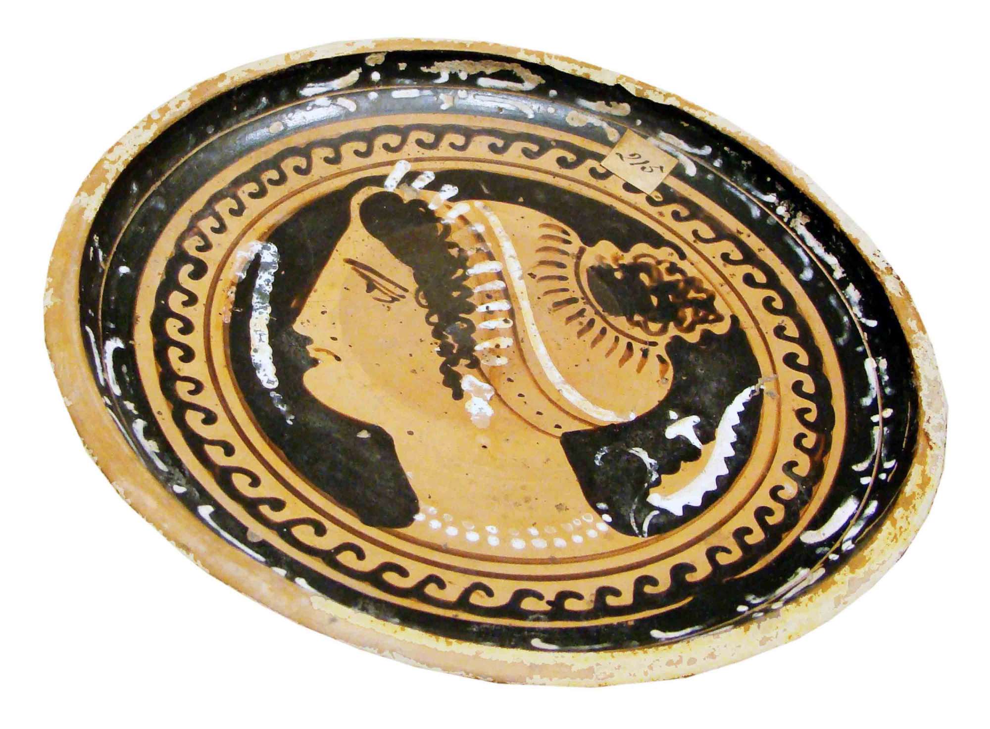 Piatto apulo a figure rosse con testa femminile con mitella entro fascia a onda marina corrente; elementi sovradipinti in bianco.