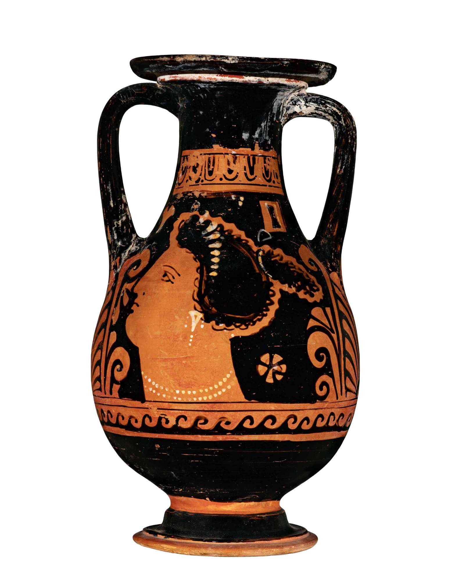 Pelike apula a figure rosse. Due fasce, una con ovuli e l'altra con meandri marini, delimitano il campo. Lato A: donna con serto, tenia e specchio nella mano destra. Lato B: testa femminile.