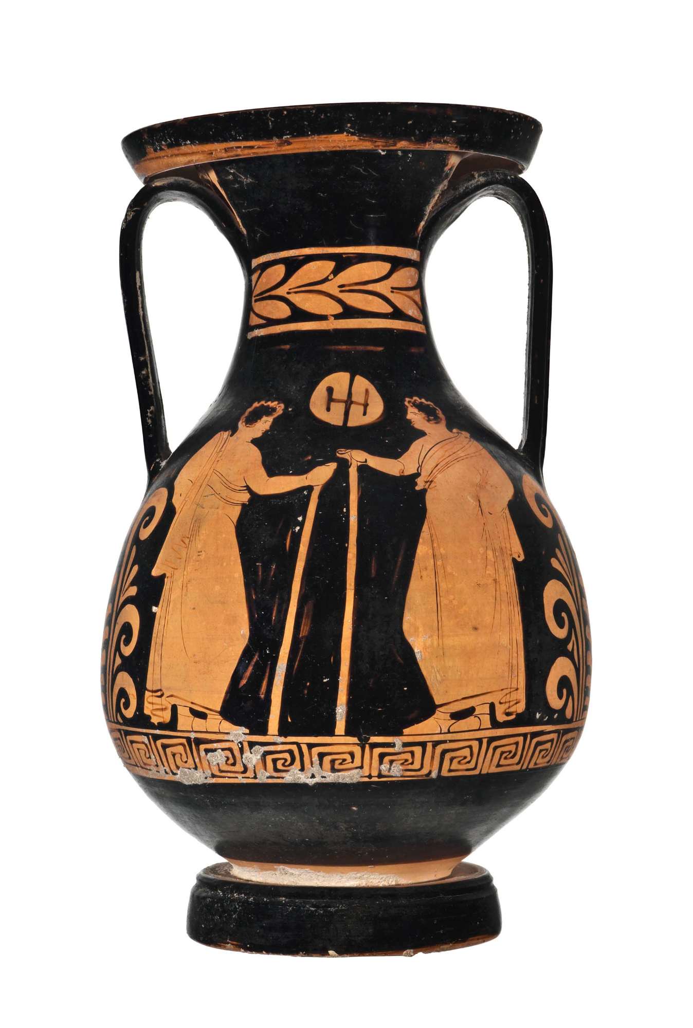 Pelike apula a figure rosse, palmette sotto le anse. Lato A: figura femminile vestita di chitone con timpano e tirso, dettagli in bianco: efebo nudo seduto con tirso e patera con serto. Lato B: due giovani ammantati con bastone.