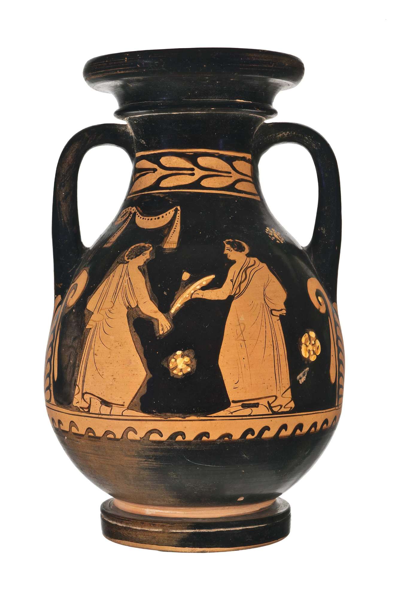 Pelike apulaa figure rosse. Lato A: donna seduta con patera con offerte ed Eros alato con serto (riccamente decorato). Lato B: due giovani ammantati con patera.