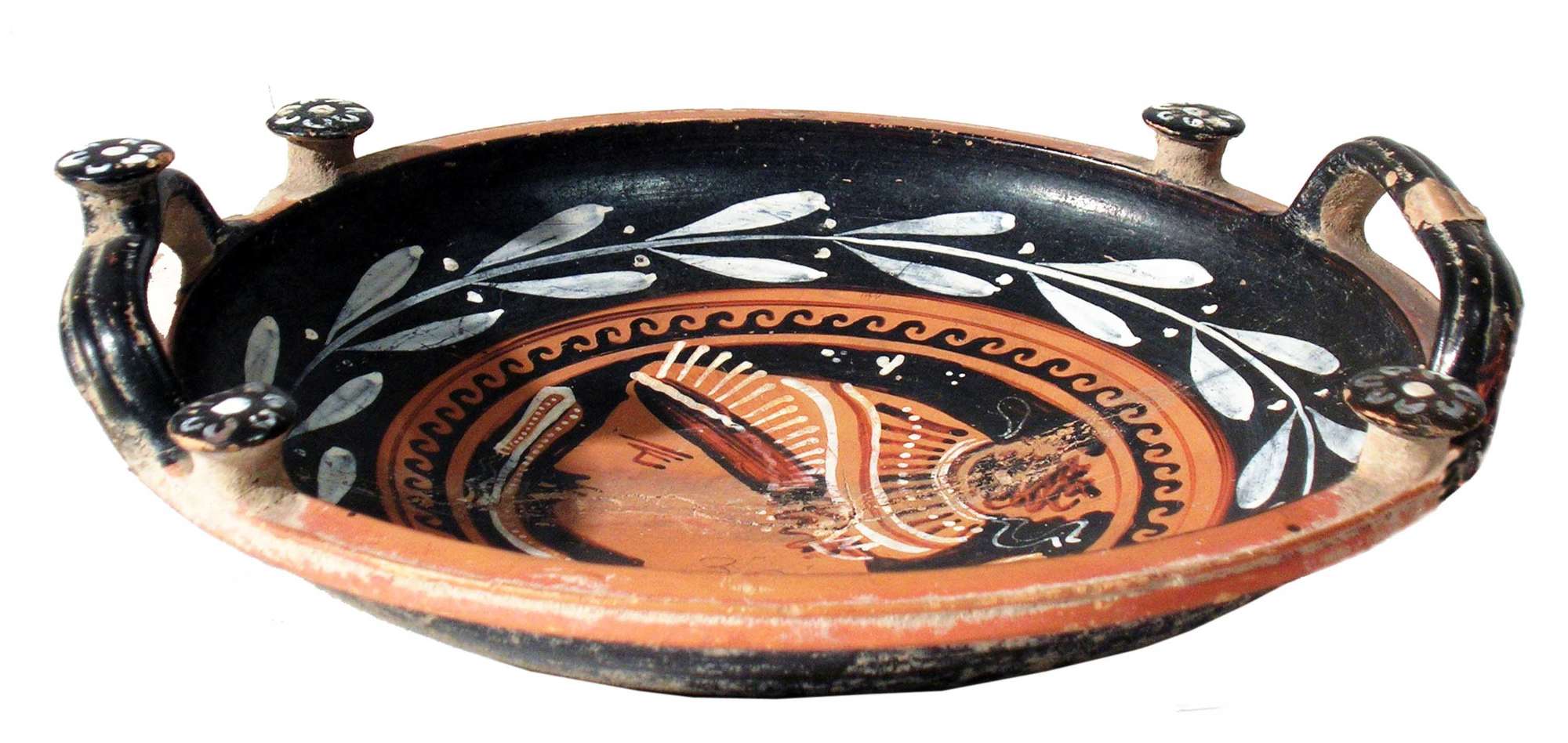 Phiale apula a figure rosse. Interno: testa femminile con mitella e dettagli in bianco all'interno di una fascia ad onda marina e ad un ramo d'alloro bianco.