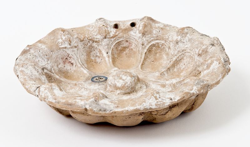 Phiale mesonfalica baccellata apula argentata. Bassa vasca emisferica, orlo ondulato ed estroflesso. All’interno, pomello rilevato al centro, baccellature concave profilate da un bordo incavato, tra le quali si dispongono, in corrispondenza dell’orlo, testine in rilievo; su un lato dell’orlo, due fori per la sospensione. La phiale presenta una spessa ingubbiatura biancastra di caolino a imitazione dei prototipi argentei.