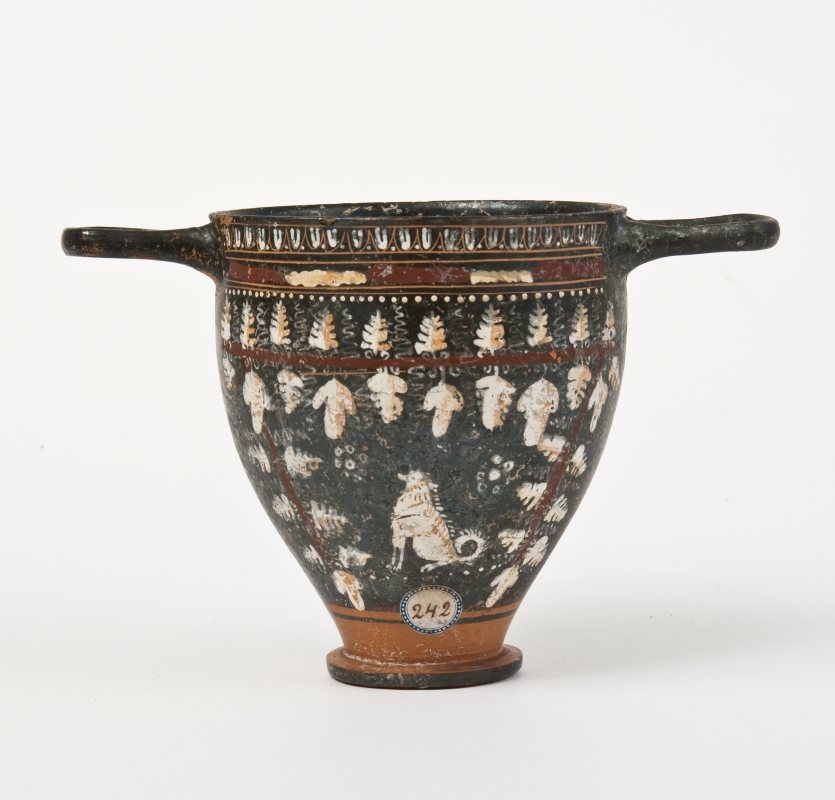 Skyphos ad anse orizzontali a vernice nera sovraddipinta. Decorazione a fasce di ovuletti, bande rosse e gialle, palmette e viticci, anche verticali sul ventre. Al centro del lato principale un cane e due rose