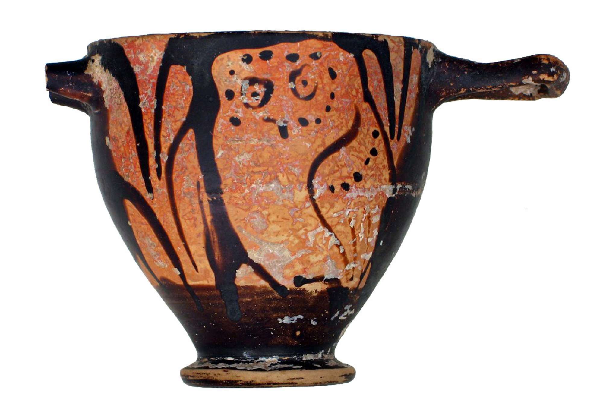 Skyphos in argilla chiara a figure rosse con immagine di civetta tra rami di alloro su entrambi i lati; anse orizzontali.