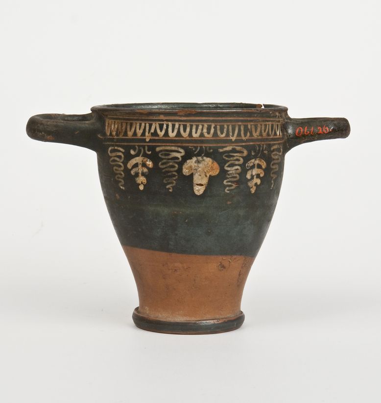 Skyphos a vernice nera opaca, tendente all'olivastro, con sovraddipinture in bianco crema e giallo e incisioni. Orlo leggermente estroflesso, corpo rastremato verso il basso, anse a nastro orizzontali, basso piede ad anello. Lato A: Sotto l'orlo tra due coppie di linee orizzontali incise, sequenza di ovuli dipinti, dalla seconda linea incisa scendono un grappolo centrale affiancato da germogli e foglie di vite, dipinti per metà in bianco e metà in giallo. Lato B: Sotto l'orlo ramo di alloro con stelo inciso e foglie in bianco crema.