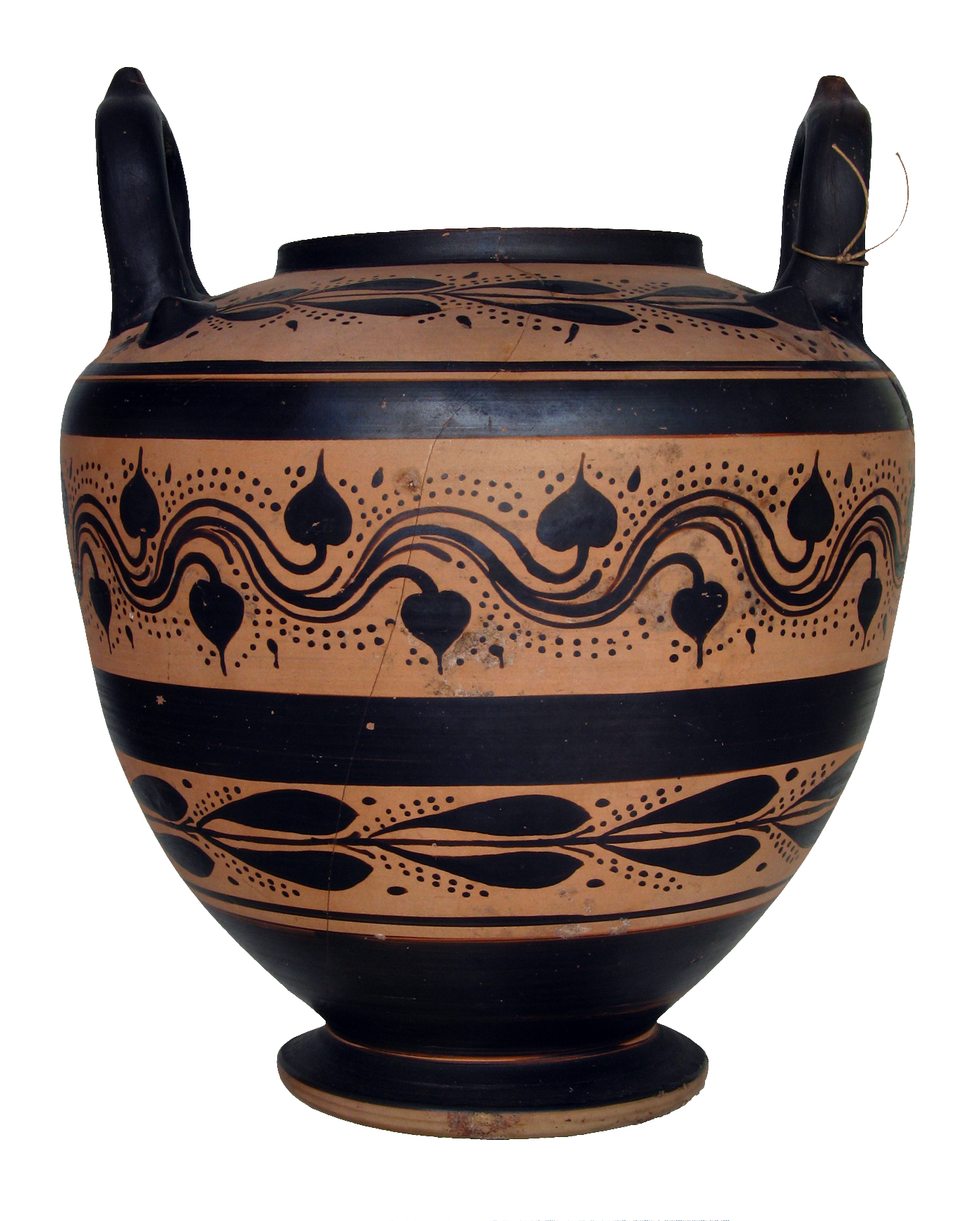 Stamnos a figure nere con decorazione a fasce alternate nere e serti d'edera e alloro con corimbi.