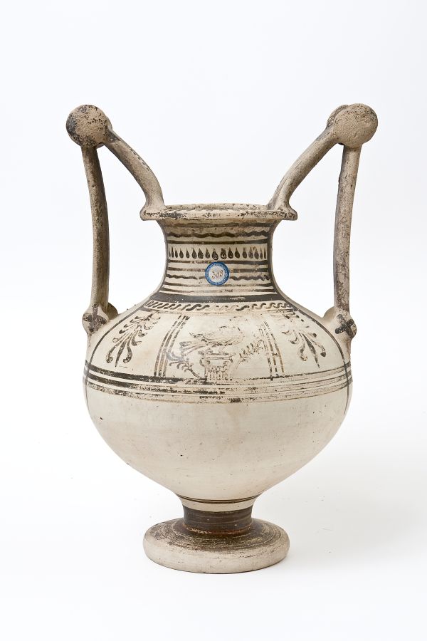 Trozzella in ceramica messapica. Orlo estroflesso, alto collo troncoconico, a profilo lievemente concavo, corpo globoso, con anse verticali sormontanti, impostate sull’orlo e sulla spalla, provviste di doppia coppia di dischi (“trozze”), di cui quelli superiori sono di dimensioni maggiori; alto piede troncoconico e spalla distinta. Decorazione monocroma in bruno-nerastro, con piede e interno dell’orlo dipinti in bruno; risparmiata la costa laterale del piede; sul collo, gruppo di linee orizzontali diritte e tremoli alternati, gocce pendenti, fascia dipinta, onde correnti; sulla spalla, una serie di pannelli definiti da linee parallele, con palmette isolate ai lati, mentre al centro un’aquila sopra una colonna ionica affiancata da racemi su un lato, una rosa (o sole) sull’altro. All’altezza del ventre, tre linee parallele; sulla parte inferiore del fusto, linee parallele; sull’orlo, tratti; sulle anse, linee verticali; dischi superiori dipinti, sui dischi inferiori, linee incrociate.