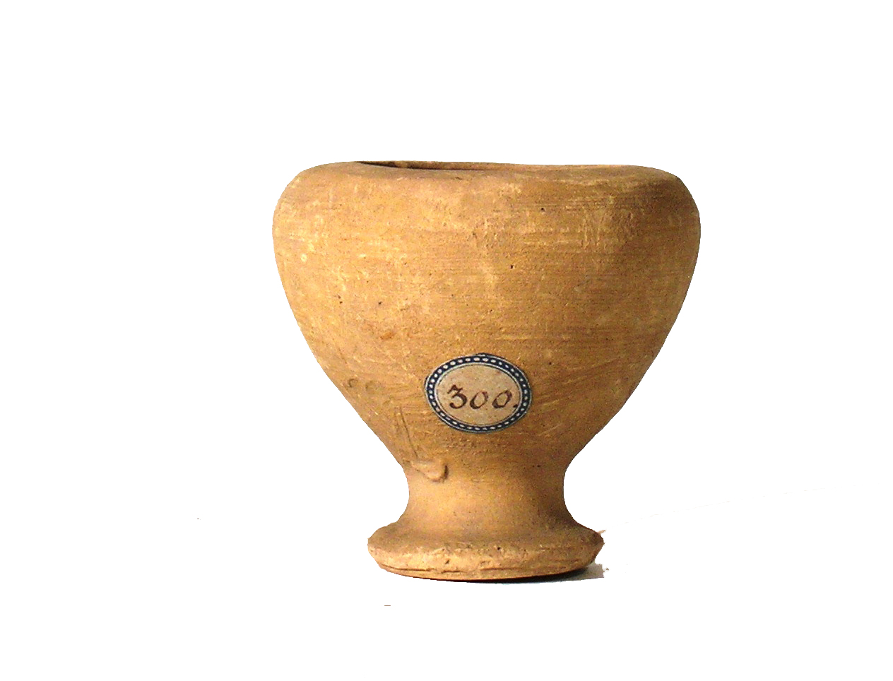 Vasetto simile a un calice con corpo piriforme senza collo e senza ansa e con l'orlo ripiegato all'interno, su alto piede che si allarga verso il basso.