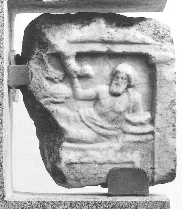 Frammento di rilievo incorniciato con figura maschile su kline che solleva un rhyton con il braccio destro.