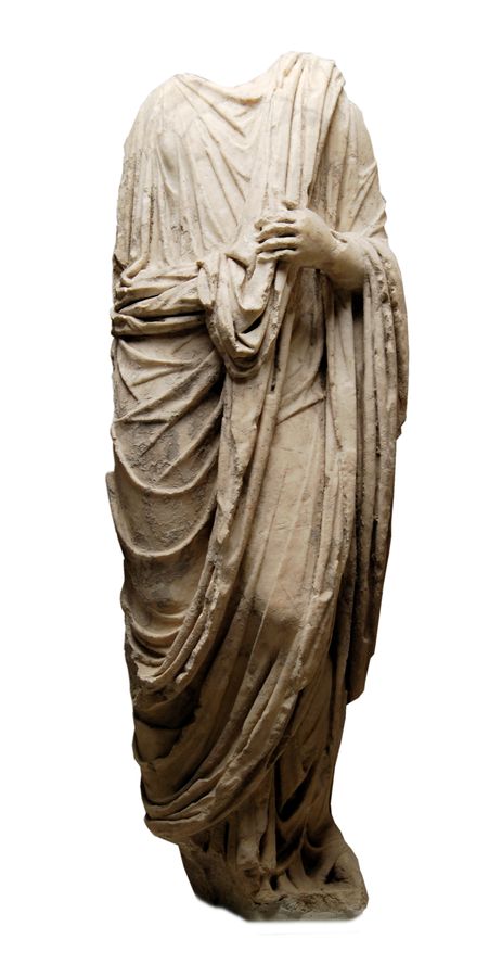 Statua, mancante della testa e del braccio destro, di grandezza poco inferiore al normale, raffigura un personaggio stante dall'ampia toga che scende fino alle caviglie e che indossa ai piedi calceus patricius. Il retro non è lavorato.