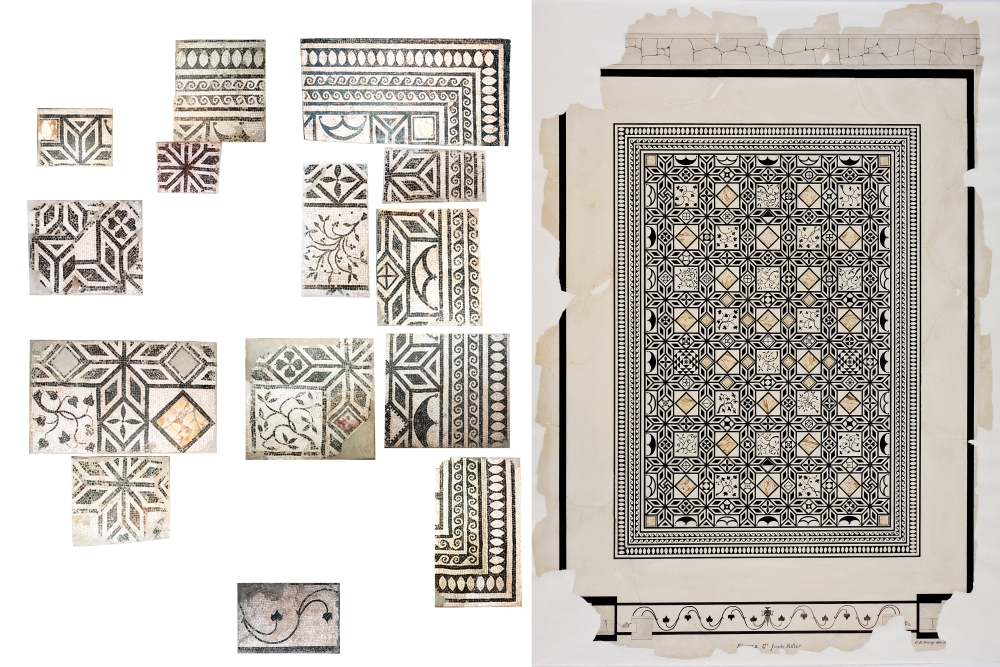 Mosaico in tredici pannelli della Terza fase edilizia. Il triclinio (sala da pranzo) C’, posto al centro del lato orientale del peristilio, aveva questo pavimento a mosaico bianco e nero con disegno a stelle di rombi e a quadrati, decorati alternativamente da rami d’edera e d’alloro, e da rombi di marmo brecciato africano giallo a venature nere. Negli spazi di risulta si inseriscono motivi geometrici e vegetali e, lungo la cornice, pelte nere e bianche. Ricca è la cornice composta da fasce decorate a onde correnti e a ovuli bianchi su fondo nero. Intorno aveva un’ampia fascia bianca delimitata da bordo nero alle pareti.