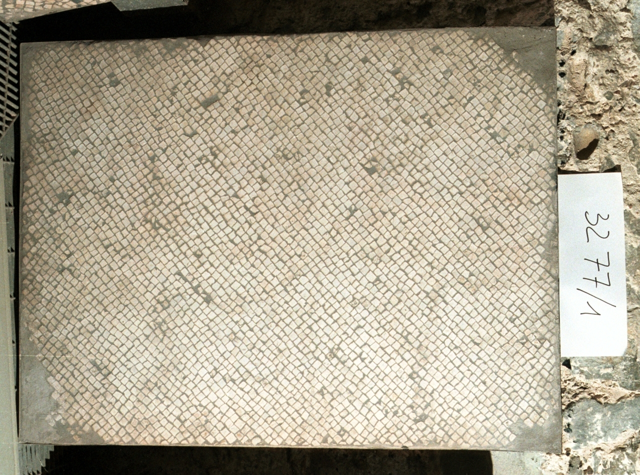 Due pannelli di mosaico a tessere bianche della prima fase edilizia.