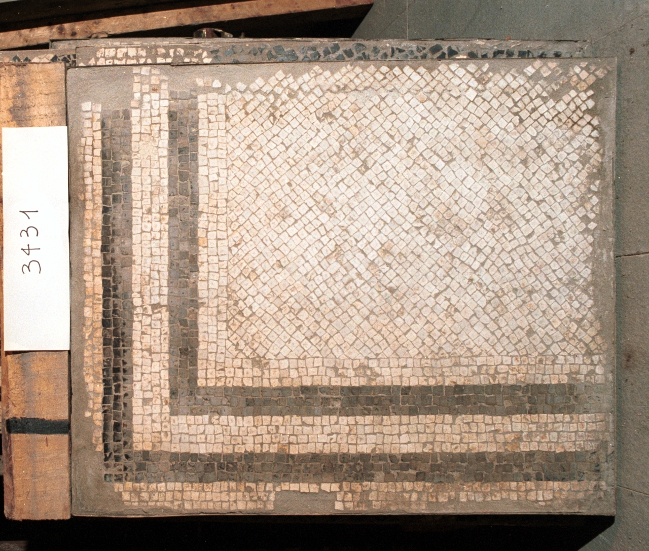 Un pannello del mosaico della seconda fase edilizia appartenuto al cubicolo B’ o al tablino V, in tessere bianche con doppia cornice nera.