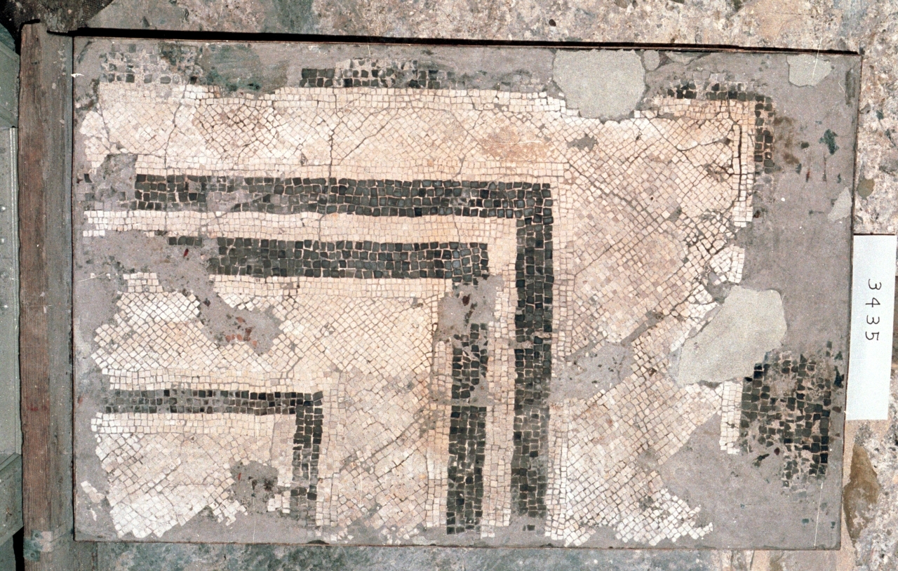 Un pannello del mosaico della seconda fase edilizia a tessere bianche con quadruplice cornice nera.