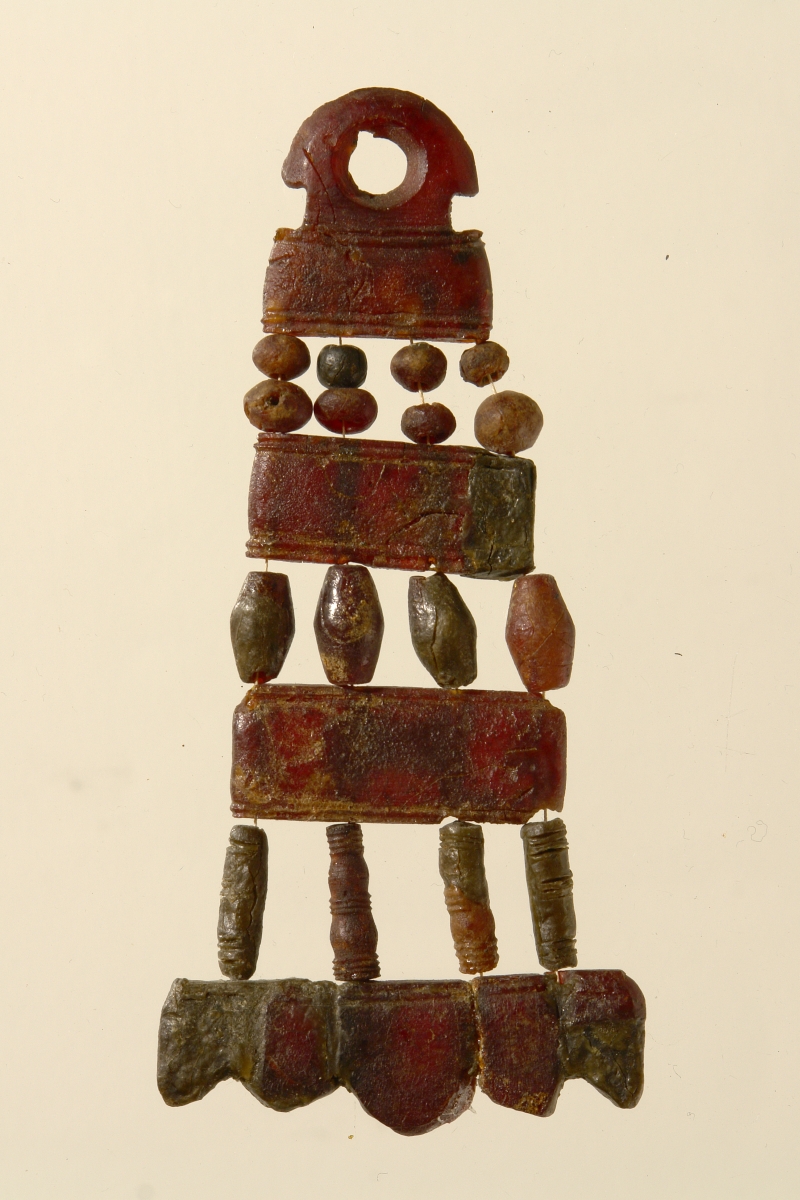 Pendente a piccolo pettorale in ambra formato da quattro passanti a piastrina rettangolare, decorati da doppie file incise orizzontali sui lati lunghi, di misura crescente verso il basso, ciascuno con quattro fori longitudinali, per i quali passava il filo che collegava le perle. La prima piastrina, sormontata da un appiccagnolo ad anello piatto con un foro centrale, è collegata alla successiva da quattro doppie perline di forma globulare schiacciata; la seconda e la terza sono collegate da quattro perle romboidali a botticella, a la terza e la quarta da perle cilindriche con strozzatura centrale, segnata da incisioni anulari. La quarta piastrina nella parte inferiore termina con cappe triangolari. Il montaggio attuale non corrisponde al disegno realizzato sullo scavo da Carlo Marchesetti.