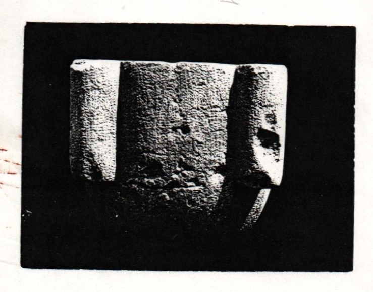 Vaso di forma circolare a fondo semisferico appiattito; presenta quattro elementi cilindrici agli angoli del blocco da cui fu scavato che non raggiungono la base e terminano arrotondati; in corrispondenza di un angolo è superiormente scavato un beccuccio per versare.