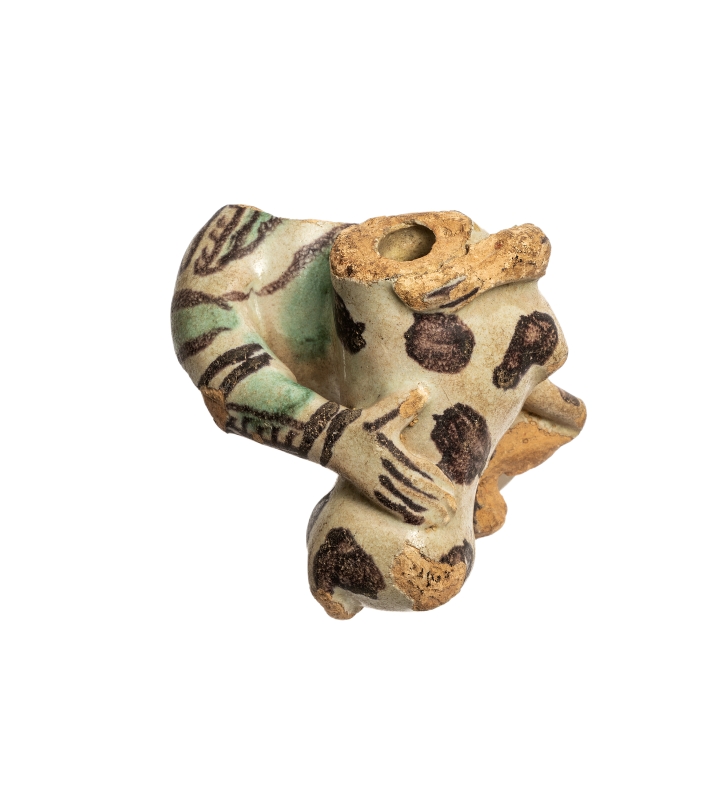 Della figura umana rimane il busto con un braccio che trattiene al petto un animale quadrupede dal manto pezzato, forse un cane.