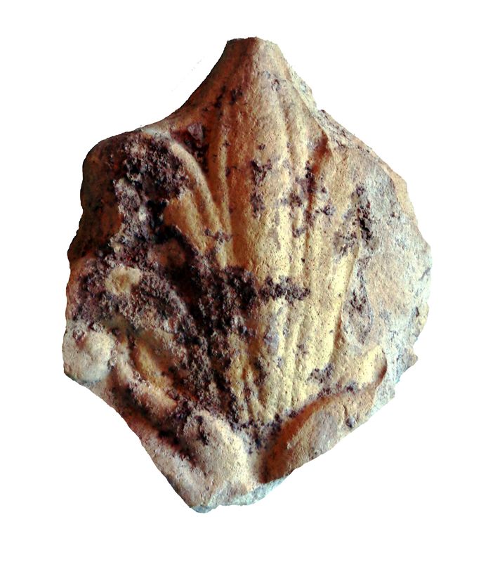 Frammento di parte superiore di antefissa di forma ogivale con ondulazioni nella parte superiore in corrispondenza della palmetta a cinque lobi. Rimangono le corna delle due protomi caprine contrapposte.