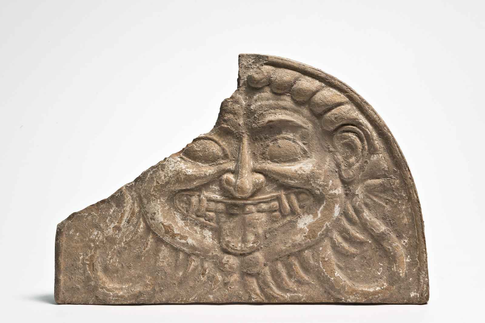 Argilla di color beige scuro, in frattura di color sabbia. Il coppo segue il bordo in tutta la sua larghezza. L’antefissa presenta, in uno stato di conservazione decisamente migliore, lo stesso tipo di gorgoneion di n. inv. 2329: i confronti con altri esemplari e le proposte di datazione, perciò, coincidono. In questo caso non si può ipotizzare l’uso della medesima matrice, poiché lo stato di conservazione dell’antefissa n. inv. 3792 non consente raffronti minuziosi.