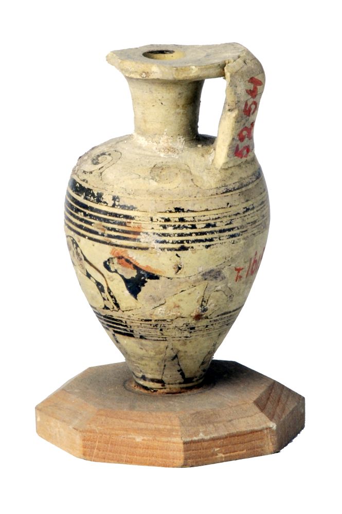 Aryballos piriforme rastremato verso il puntale etrusco-corinzio a fasce con animali/cani in corsa.