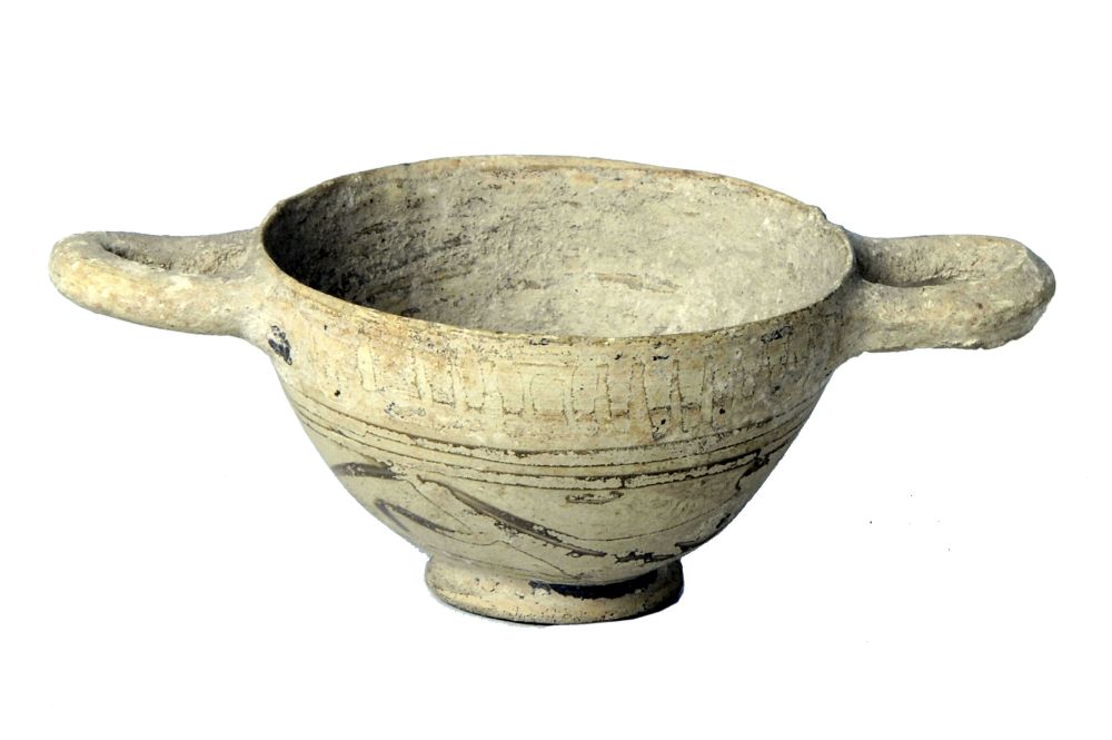 Skyphos miniaturistico corinzio a fasce con decorazioni figurate molto evanidi: due animali in corsa.
