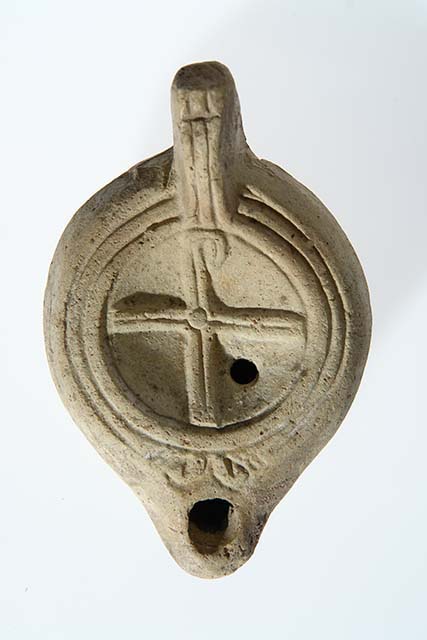 Lucerna a disco a corpo ovoidale, becco arrotondato con attacco formato da rudimentali volute, ansa piena appuntita scanalata. Nel disco concavo è realizzata a rilievo una croce monogrammatica con occhiello a destra, con incisione centrale. Realizzata in argilla di colore nocciola con abbondanti tracce del rivestimento bianco e lavorata a stampo doppio.