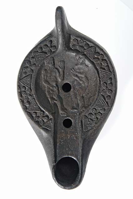 Lucerna africana. Ansa piena, puntuta. Il disco concavo presenta due figure umane: uomo e donna nudi, rispettivamente a sinistra e a destra di due «infundibula» verticali. È la rappresentazione tipica di Adamo ed Eva; il disegno risulta plastico e vigoroso, nonostante il tratto rozzo; la testa di Adamo, posta di profilo, guarda Eva; figura di fronte con braccio sinistro alzato, con la palma aperta. Eva, posta prospetticamente rispetto ad Adamo, reca la mano sinistra al petto: le dita sono aperte ed affusolate. L'orlo è decorato da otto motivi geometrici per parte: triangoli gemmati e fiori cruciformi alternati, intramezzati da sei perle. Ansa piena, puntuta. Sottofondo piatto con piedino circolare, in rilievo, al cui centro due circonferenze concentriche.