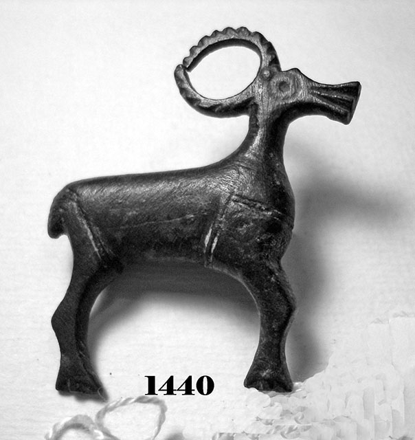 Fibula laminare a forma di cervo, priva dell'ardiglione; il corpo è decorato ad occhi di dado.