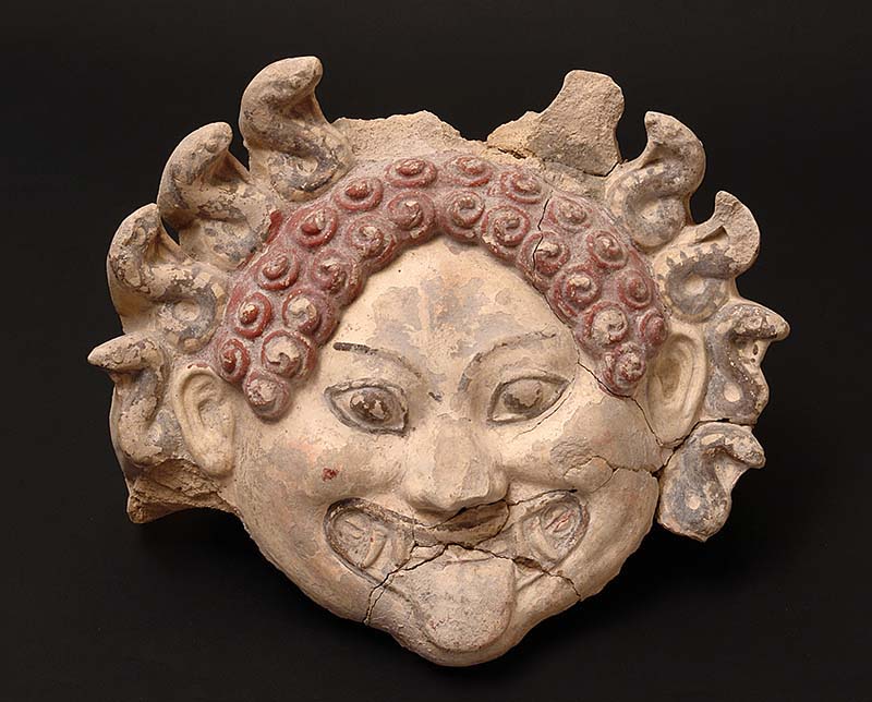 L'antefissa presenta un gorgoneion: il volto è circondato da corona di serpentelli che nella metà superiore si ergono minacciosi. I capelli formano due file di riccioli sulla fronte; gli occhi sono allungati, obliqui e sporgenti; le orecchie piccole sono poste più in basso del solito; la bocca arcuata aperta mostra la lingua e i denti con le zanne. Il pezzo conserva parte dell'ingubbiatura e tracce della colorazione: rosso scuro nei capelli e nella lingua; un tenue rosato sulla fronte e sulle gote; nero per i serpenti, le sopracciglia, le palpebre, le pupille e le labbra.