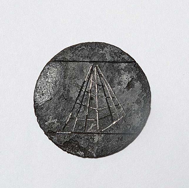 Il piccolo dischetto circolare conserva su ambo le facce la figura di una piramide o analemma per la lettura delle ore con l'indicazione dei diversi mesi dell'anno, rispettivamente alla latitudine di Roma (RO) da una parte, e di un'altra città forse Ravenna (RA) dall'altro. Per venir usato doveva essere probabilmente inserito in un cilindro di analogo materiale. Tracce d'argento nelle incisioni dell'analemma.