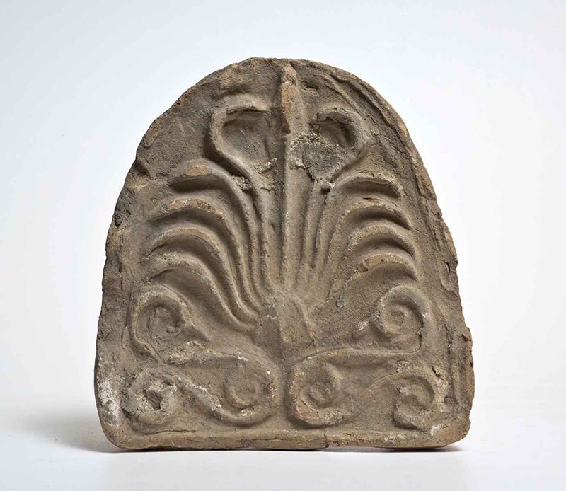 Argilla di color beige, in frattura di colore rosato. Rare tracce di biancastro su petali, volute e sfondo. Un listello funge da contorno della lastra; alla base vi sono due elementi terminanti alle estremità in volute, da cui spuntano altri due elementi, che si sviluppano orizzontalmente e terminano in volute, e un triangolo; da questo spuntano undici petali sottili e incavati: il centrale è dritto fino al bordo superiore, i due laterali a questo si curvano verso l'interno, i restanti verso l'esterno.